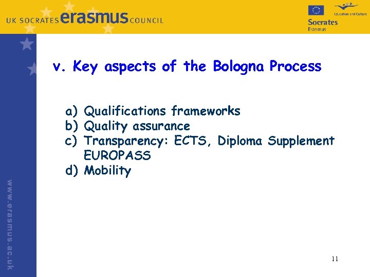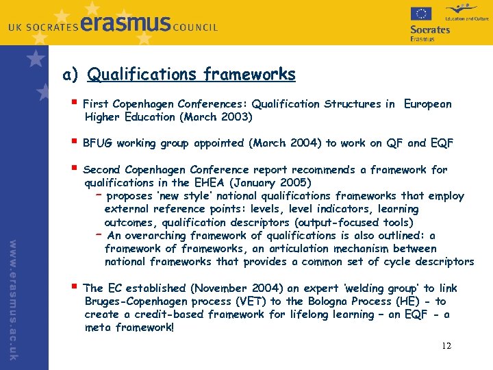 v. Key aspects of the Bologna Process a) Qualifications frameworks b) Quality assurance c) Transparency: ECTS, Diploma Supplement EUROPASS d) Mobility 11