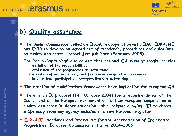 a) Qualifications frameworks § First Copenhagen Conferences: Qualification Structures in Higher Education (March 2003) European § BFUG working group appointed (March 2004) to work on QF and EQF § Second Copenhagen Conference report recommends a framework for qualifications in the EHEA (January 2005) - proposes ‘new style’ national qualifications frameworks that employ external reference points: levels, level indicators, learning outcomes, qualification descriptors (output-focused tools) - An overarching framework of qualifications is also outlined: a framework of frameworks, an articulation mechanism between national frameworks that provides a common set of cycle descriptors § The EC established (November 2004) an expert ‘welding group’ to link Bruges-Copenhagen process (VET) to the Bologna Process (HE) - to create a credit-based framework for lifelong learning – an EQF - a meta framework! 12