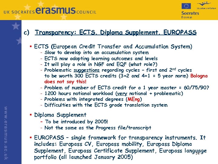 c) Transparency: ECTS, Diploma Supplement, EUROPASS § ECTS (European Credit Transfer and Accumulation System) - Slow to develop into an accumulation system ECTS now adopting learning outcomes and levels It will play a role in NGF and EQF (what role? ) Problematic suggestions regarding cycles – first and 2 nd cycles to be worth 300 ECTS credits (3+2 and 4+1 = 5 year norm) Bologna does not say this! Problem of number of ECTS credit for a 1 year master = 60/75/90? 1200 hours notional workload (very notional + problematic) Problems with integrated degrees (MEng) Difficulties with the ECTS grade translation system § Diploma Supplement - To be introduced by 2005! - Not the same as the Progress file/transcript § EUROPASS – single framework for transparency instruments. It includes: Europass CV, Europass mobility, Europass Diploma Supplement, Europass Certificate Supplement, Europass language 14 portfolio (all launched January 2005)