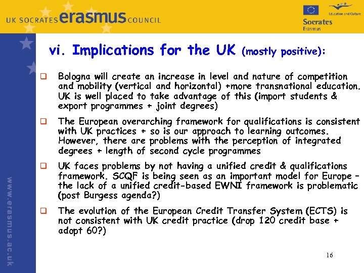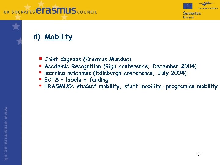 d) Mobility § Joint § § degrees (Erasmus Mundus) Academic Recognition (Riga conference, December 2004) learning outcomes (Edinburgh conference, July 2004) ECTS – labels + funding ERASMUS: student mobility, staff mobility, programme mobility 15