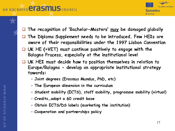 vi. Implications for the UK (mostly positive): q Bologna will create an increase in level and nature of competition and mobility (vertical and horizontal) +more transnational education. UK is well placed to take advantage of this (import students & export programmes + joint degrees) q The European overarching framework for qualifications is consistent with UK practices + so is our approach to learning outcomes. However, there are problems with the perception of integrated degrees + length of second cycle programmes q UK faces problems by not having a unified credit & qualifications framework. SCQF is being seen as an important model for Europe – the lack of a unified credit-based EWNI framework is problematic (post Burgess agenda? ) q The evolution of the European Credit Transfer System (ECTS) is not consistent with UK credit practice (drop 120 credit base + adopt 60? ) 16