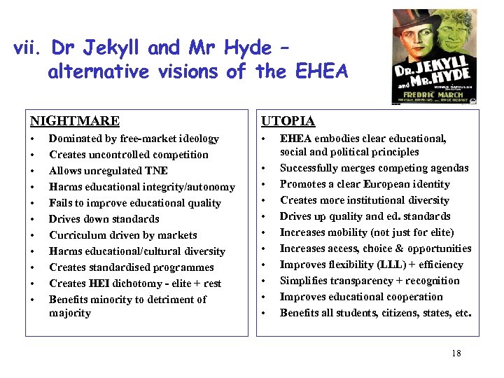 vii. Dr Jekyll and Mr Hyde – alternative visions of the EHEA NIGHTMARE UTOPIA • • • Dominated by free-market ideology Creates uncontrolled competition Allows unregulated TNE Harms educational integrity/autonomy Fails to improve educational quality Drives down standards Curriculum driven by markets Harms educational/cultural diversity Creates standardised programmes Creates HEI dichotomy - elite + rest Benefits minority to detriment of majority • • • EHEA embodies clear educational, social and political principles Successfully merges competing agendas Promotes a clear European identity Creates more institutional diversity Drives up quality and ed. standards Increases mobility (not just for elite) Increases access, choice & opportunities Improves flexibility (LLL) + efficiency Simplifies transparency + recognition Improves educational cooperation Benefits all students, citizens, states, etc. 18