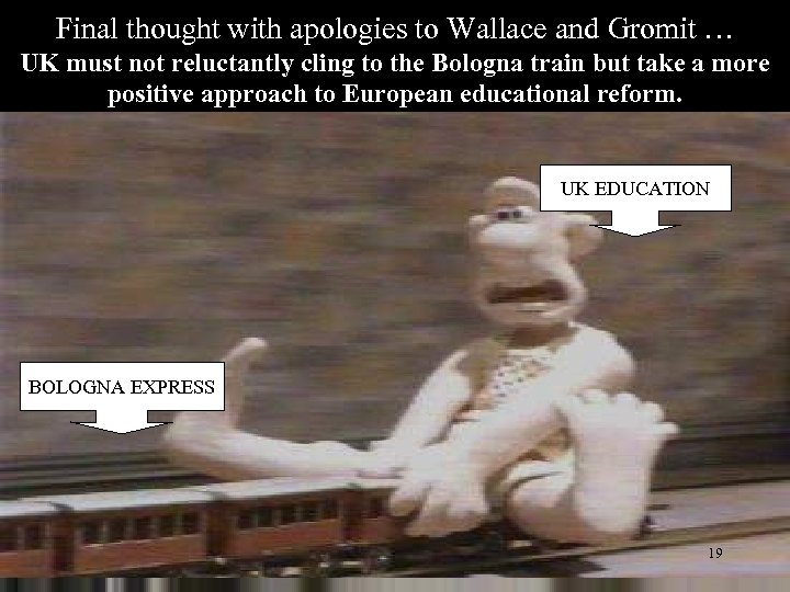 Final thought with apologies to Wallace and Gromit … UK must not reluctantly cling to the Bologna train but take a more positive approach to European educational reform. UK EDUCATION BOLOGNA EXPRESS 19