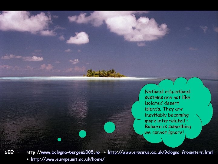 National educational systems are not like isolated desert islands. They are inevitably becoming more interrelated – Bologna is something we cannot ignore! SEE: http: //www. bologna-bergen 2005. no + http: //www. erasmus. ac. uk/Bologna_Promoters. html 20 + http: //www. europeunit. ac. uk/home/