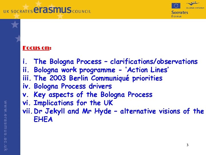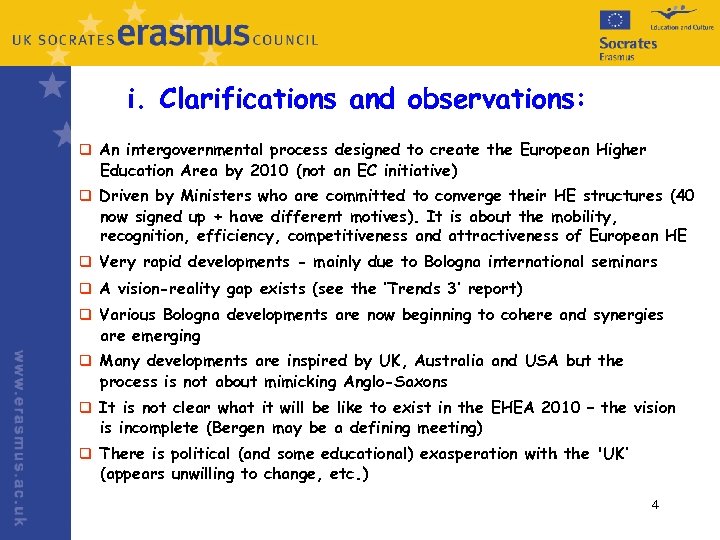 Focus on: i. The Bologna Process – clarifications/observations ii. Bologna work programme - ‘Action Lines’ iii. The 2003 Berlin Communiqué priorities iv. Bologna Process drivers v. Key aspects of the Bologna Process vi. Implications for the UK vii. Dr Jekyll and Mr Hyde – alternative visions of the EHEA 3