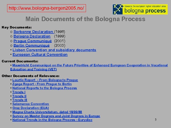 http: //www. bologna-bergen 2005. no/ Main Documents of the Bologna Process Key Documents: o Sorbonne Declaration (1998) o Bologna Declaration (1999) o Prague Communiqué (2001) o Berlin Communiqué (2003) • Lisbon Convention and subsidiary documents • European Cultural Convention Current Documents: • Maastricht Communiqué on the Future Priorities of Enhanced European Cooperation in Vocational Education and Training (VET) Other Documents of Relevance: • Lourtie Report - From Bologna to Prague • Zgaga Report - From Prague to Berlin • National Reports to the Bologna Process • Trends III • Salamanca Convention • Graz Declaration (EUA) • Magna Charta Universitatum, dated 18/09/88 • Survey on Master Degrees and Joint Degrees in Europe • National Trends in the Bologna Process - Eurydice 5