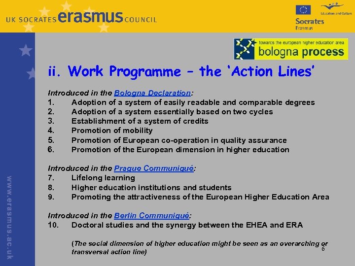 ii. Work Programme – the ‘Action Lines’ Introduced in the Bologna Declaration: 1. Adoption of a system of easily readable and comparable degrees 2. Adoption of a system essentially based on two cycles 3. Establishment of a system of credits 4. Promotion of mobility 5. Promotion of European co-operation in quality assurance 6. Promotion of the European dimension in higher education Introduced in the Prague Communiqué: 7. Lifelong learning 8. Higher education institutions and students 9. Promoting the attractiveness of the European Higher Education Area Introduced in the Berlin Communiqué: 10. Doctoral studies and the synergy between the EHEA and ERA (The social dimension of higher education might be seen as an overarching or 6 transversal action line)