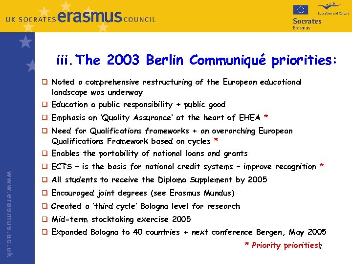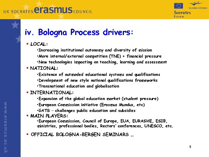 iii. The 2003 Berlin Communiqué priorities: q Noted a comprehensive restructuring of the European educational landscape was underway q Education a public responsibility + public good q Emphasis on ‘Quality Assurance’ at the heart of EHEA * q Need for Qualifications frameworks + an overarching European Qualifications Framework based on cycles * q Enables the portability of national loans and grants q ECTS – is the basis for national credit systems – improve recognition * q All students to receive the Diploma Supplement by 2005 q Encouraged joint degrees (see Erasmus Mundus) q Created a ‘third cycle’ Bologna level for research q Mid-term stocktaking exercise 2005 q Expanded Bologna to 40 countries + next conference Bergen, May 2005 * Priority priorities!7