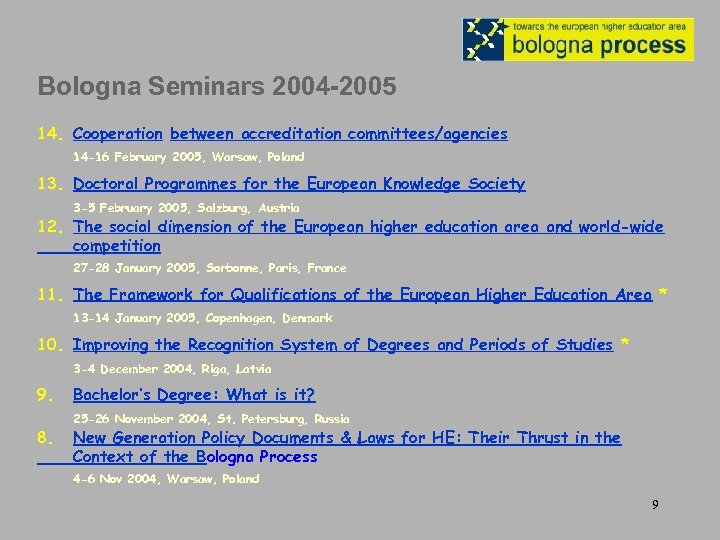 Bologna Seminars 2004 -2005 14. Cooperation between accreditation committees/agencies 14 -16 February 2005, Warsaw, Poland 13. Doctoral Programmes for the European Knowledge Society 3 -5 February 2005, Salzburg, Austria 12. The social dimension of the European higher education area and world-wide competition 27 -28 January 2005, Sorbonne, Paris, France 11. The Framework for Qualifications of the European Higher Education Area * 13 -14 January 2005, Copenhagen, Denmark 10. Improving the Recognition System of Degrees and Periods of Studies * 3 -4 December 2004, Riga, Latvia 9. 8. Bachelor’s Degree: What is it? 25 -26 November 2004, St. Petersburg, Russia New Generation Policy Documents & Laws for HE: Their Thrust in the Context of the Bologna Process 4 -6 Nov 2004, Warsaw, Poland 9