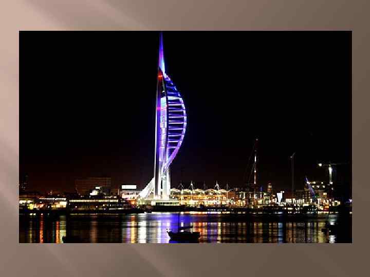 Portsmouthattractions: Spinnaker Tower Spinnaker tower-tower with a height of 170 meters above sea level and 2. 5 times higher than Nelson's column; is the tallest building in the UK outside of London and the centre for the reconstruction of the port of Portsmouth.