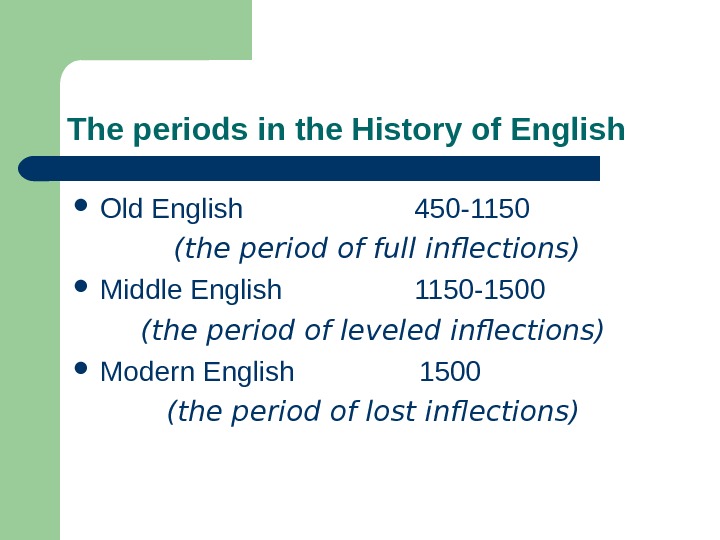 The periods in the History of English Old English 449 -1066 (the period of full inflections) Middle English 1066 -1475 (the period of leveled inflections) Modern English 15 th century onwards (the period of lost inflections)