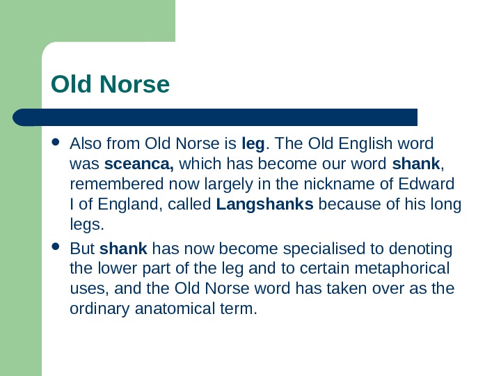 Old Norse Also from Old Norse is leg. The Old English word was sceanca, which has become our word shank , remembered now largely in the nickname of Edward I of England, called Langshanks because of his long legs. But shank has now become specialised to denoting the lower part of the leg and to certain metaphorical uses, and the Old Norse word has taken over as the ordinary anatomical term.