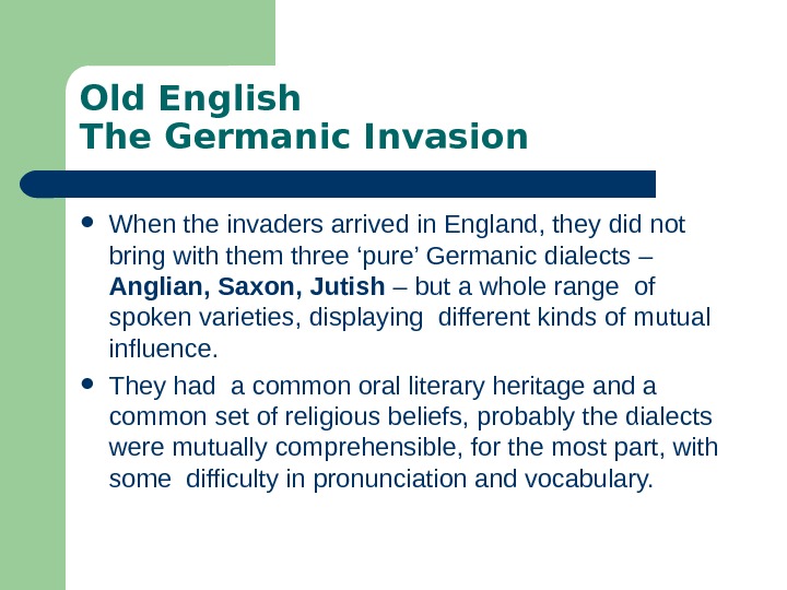 Old English The Germanic Invasion When the invaders arrived in England, they did not bring with them three ‘pure’ Germanic dialects – Anglian, Saxon, Jutish – but a whole range of spoken varieties, displaying different kinds of mutual influence. They had a common oral literary heritage and a common set of religious beliefs, probably the dialects were mutually comprehensible, for the most part, with some difficulty in pronunciation and vocabulary.