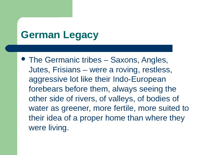 German Legacy The Germanic tribes – Saxons, Angles, Jutes, Frisians – were a roving, restless, aggressive lot like their Indo-European forebears before them, always seeing the other side of rivers, of valleys, of bodies of water as greener, more fertile, more suited to their idea of a proper home than where they were living.