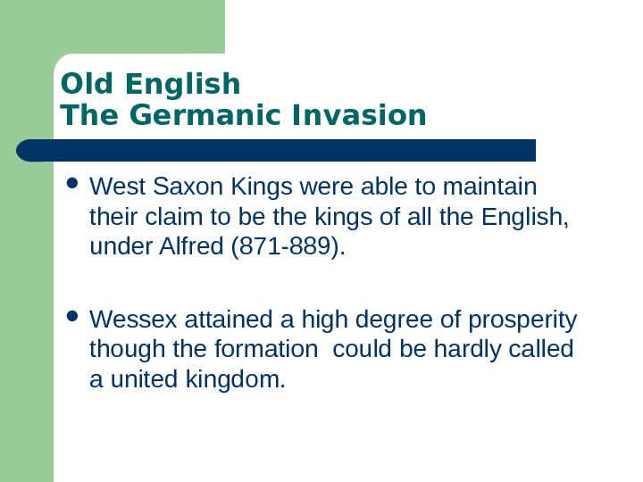 Old English The Germanic Invasion West Saxon Kings were able to maintain their claim to be the kings of all the English, under Alfred (871 -889). Wessex attained a high degree of prosperity though the formation could be hardly called a united kingdom.