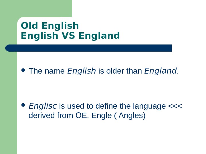 Old English VS England The name English is older than England. Englisc is used to define the language <<< derived from OE. Engle ( Angles)