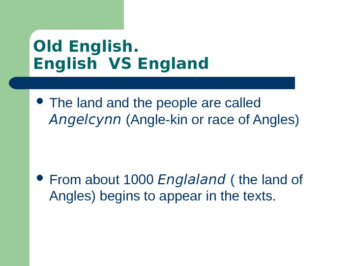 Old English VS England The land the people are called Angelcynn (Angle-kin or race of Angles) From about 1000 Englaland ( the land of Angles) begins to appear in the texts.