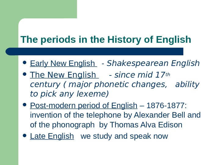 The periods in the History of English Early New English — Shakespearean English The New English — since mid 17 th century ( major phonetic changes, ability to pick any lexeme) Post-modern period of English – 1876 -1877: invention of the telephone by Alexander Bell and of the phonograph by Thomas Alva Edison Late English we study and speak now