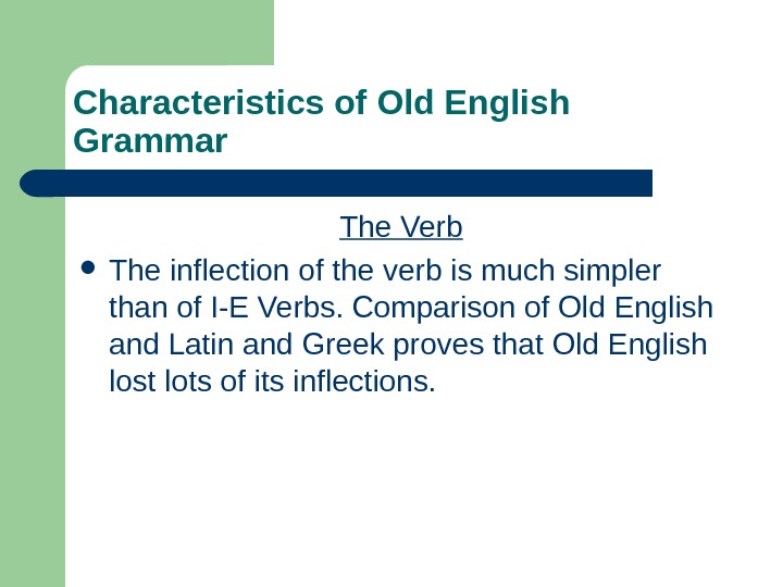 Characteristics of Old English Grammar The Verb The inflection of the verb is much simpler than of I-E Verbs. Comparison of Old English and Latin and Greek proves that Old English lost lots of its inflections.