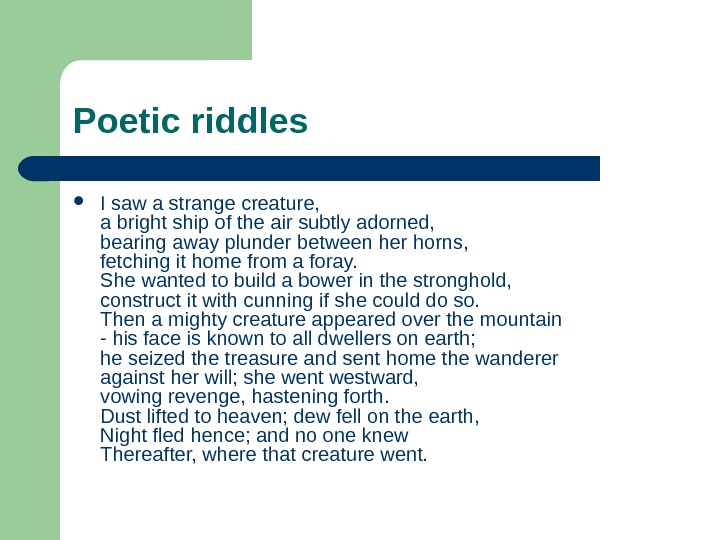 Poetic riddles I saw a strange creature, a bright ship of the air subtly adorned, bearing away plunder between her horns, fetching it home from a foray. She wanted to build a bower in the stronghold, construct it with cunning if she could do so. Then a mighty creature appeared over the mountain — his face is known to all dwellers on earth; he seized the treasure and sent home the wanderer against her will; she went westward, vowing revenge, hastening forth. Dust lifted to heaven; dew fell on the earth, Night fled hence; and no one knew Thereafter, where that creature went.