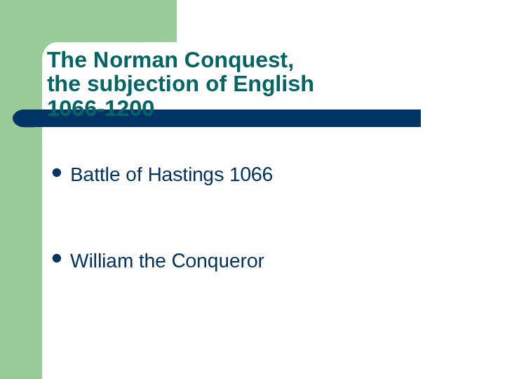 The Norman Conquest, the subjection of English 1066 -1200 Battle of Hastings 1066 William the Conqueror