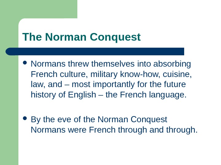 The Norman Conquest Normans threw themselves into absorbing French culture, military know-how, cuisine, law, and – most importantly for the future history of English – the French language. By the eve of the Norman Conquest Normans were French through and through.
