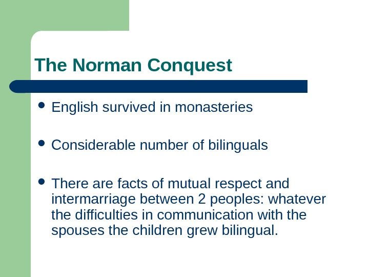 The Norman Conquest English survived in monasteries Considerable number of bilinguals There are facts of mutual respect and intermarriage between 2 peoples: whatever the difficulties in communication with the spouses the children grew bilingual.