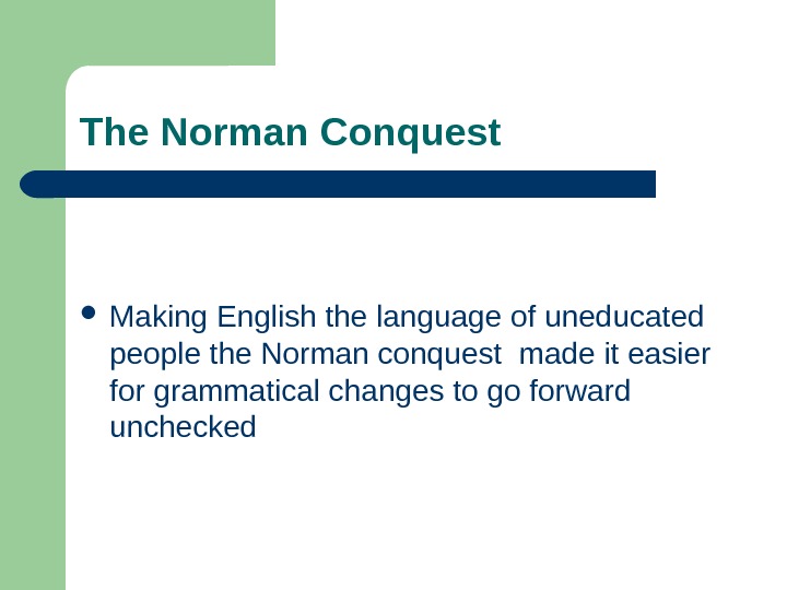 The Norman Conquest Making English the language of uneducated people the Norman conquest made it easier for grammatical changes to go forward unchecked