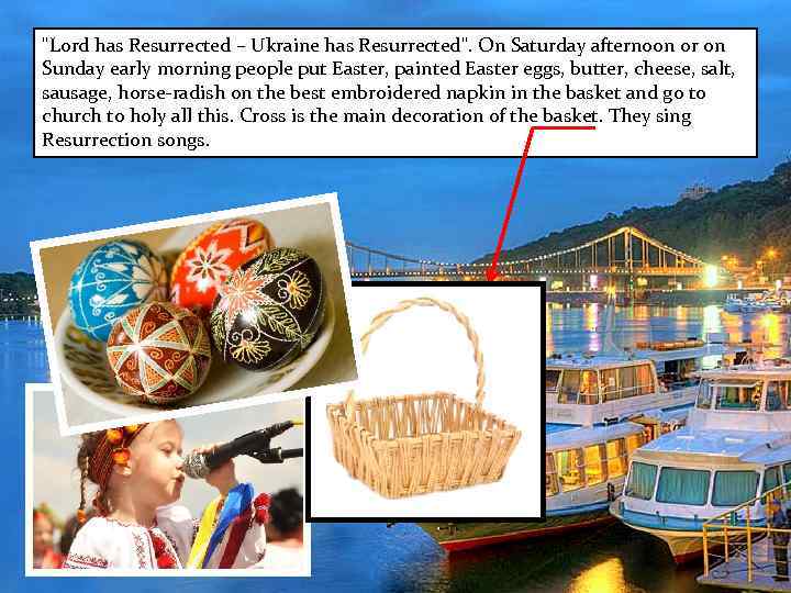 "Lord has Resurrected – Ukraine has Resurrected". On Saturday afternoon or on Sunday early morning people put Easter, painted Easter eggs, butter, cheese, salt, sausage, horse-radish on the best embroidered napkin in the basket and go to church to holy all this. Cross is the main decoration of the basket. They sing Resurrection songs.