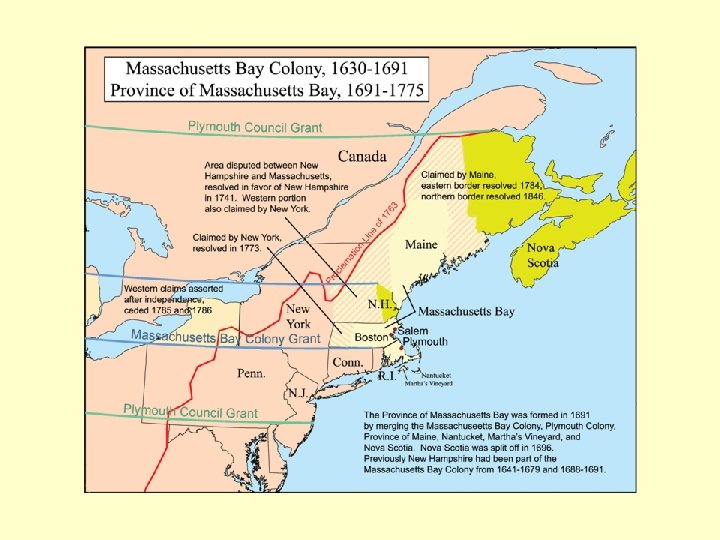 Massachusetts Bay Colony • • • Est. 1629 John Winthrop (1587 -1649) Covenant Theology (Genesis 17) Spirit of Amos (Chap 5, Chap 6) City on a Hill Challenge with dissenters: Anne Hutchinson, Roger Williams. • Challenge with Children: Half-Way Covenant • Challenge with Demons: Witchcraft in Salem and Elsewhere