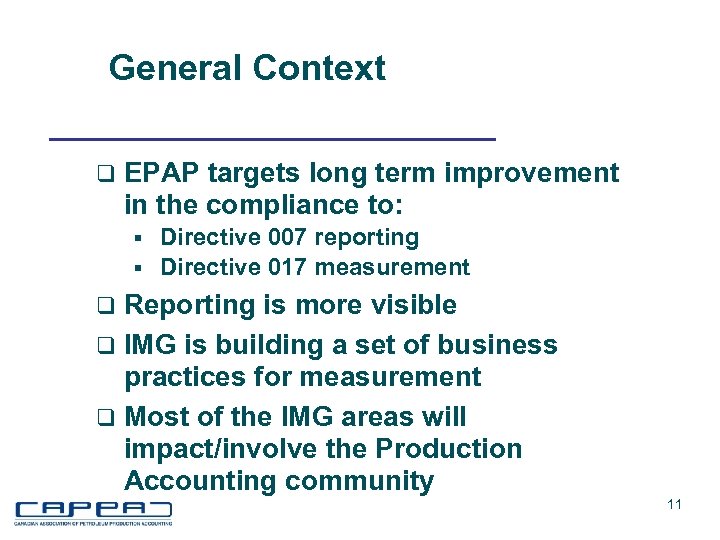 General Context q EPAP targets long term improvement in the compliance to: Directive 007 reporting § Directive 017 measurement § Reporting is more visible q IMG is building a set of business practices for measurement q Most of the IMG areas will impact/involve the Production Accounting community q 11
