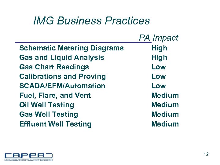 IMG Business Practices PA Impact Schematic Metering Diagrams Gas and Liquid Analysis Gas Chart Readings Calibrations and Proving SCADA/EFM/Automation Fuel, Flare, and Vent Oil Well Testing Gas Well Testing Effluent Well Testing High Low Low Medium 12