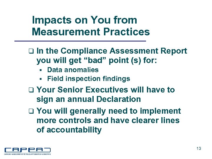 Impacts on You from Measurement Practices q In the Compliance Assessment Report you will get “bad” point (s) for: Data anomalies § Field inspection findings § Your Senior Executives will have to sign an annual Declaration q You will generally need to implement more controls and have clearer lines of accountability q 13