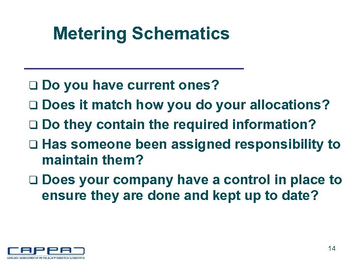 Metering Schematics Do you have current ones? q Does it match how you do your allocations? q Do they contain the required information? q Has someone been assigned responsibility to maintain them? q Does your company have a control in place to ensure they are done and kept up to date? q 14