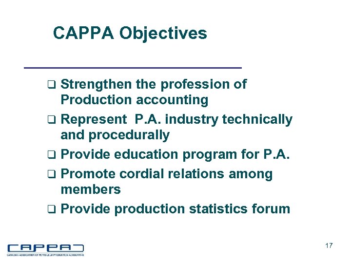 CAPPA Objectives Strengthen the profession of Production accounting q Represent P. A. industry technically and procedurally q Provide education program for P. A. q Promote cordial relations among members q Provide production statistics forum q 17