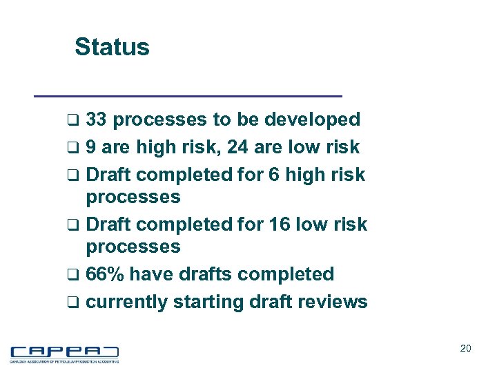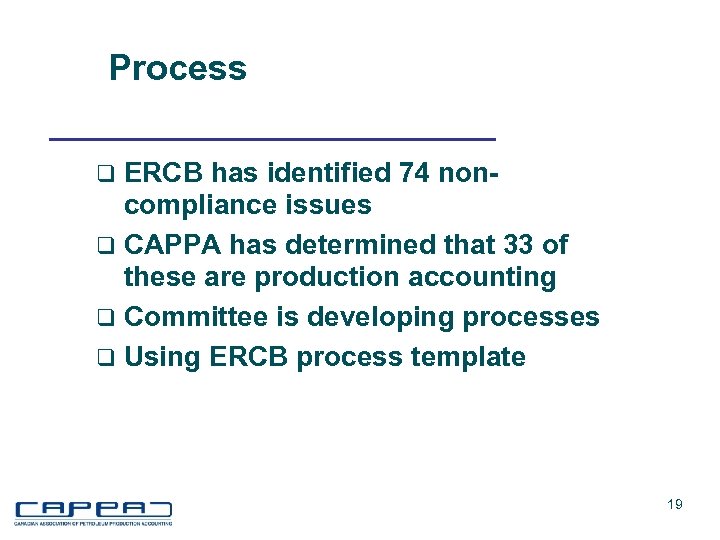 Process ERCB has identified 74 noncompliance issues q CAPPA has determined that 33 of these are production accounting q Committee is developing processes q Using ERCB process template q 19