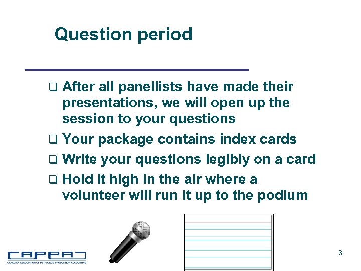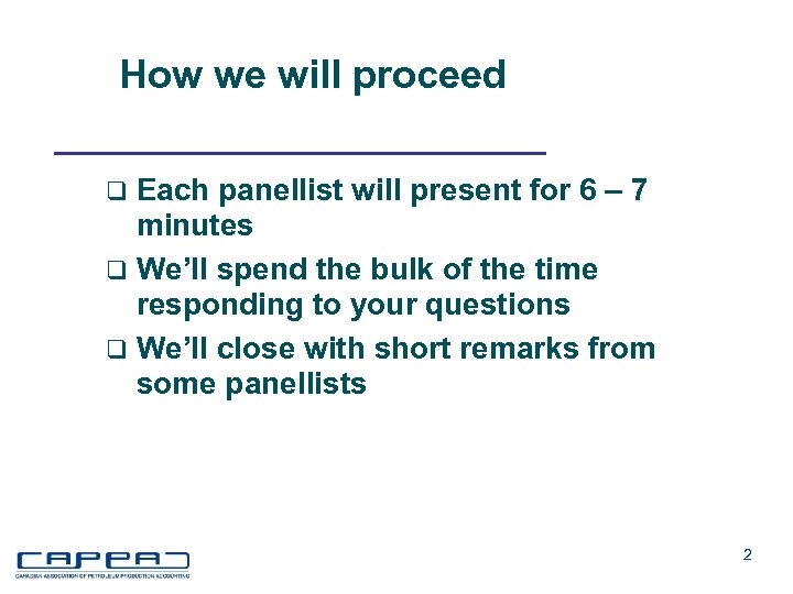 How we will proceed Each panellist will present for 6 – 7 minutes q We’ll spend the bulk of the time responding to your questions q We’ll close with short remarks from some panellists q 2