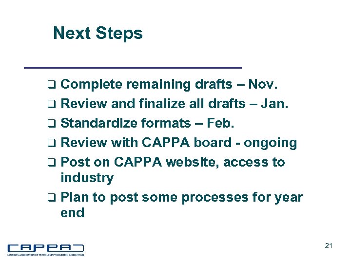 Next Steps Complete remaining drafts – Nov. q Review and finalize all drafts – Jan. q Standardize formats – Feb. q Review with CAPPA board - ongoing q Post on CAPPA website, access to industry q Plan to post some processes for year end q 21