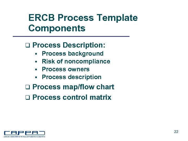 ERCB Process Template Components q Process Description: Process background § Risk of noncompliance § Process owners § Process description § Process map/flow chart q Process control matrix q 22