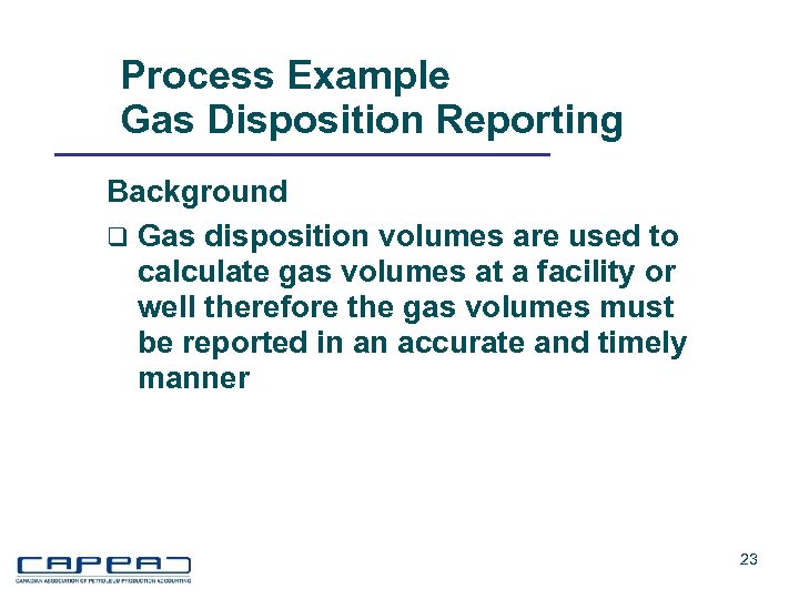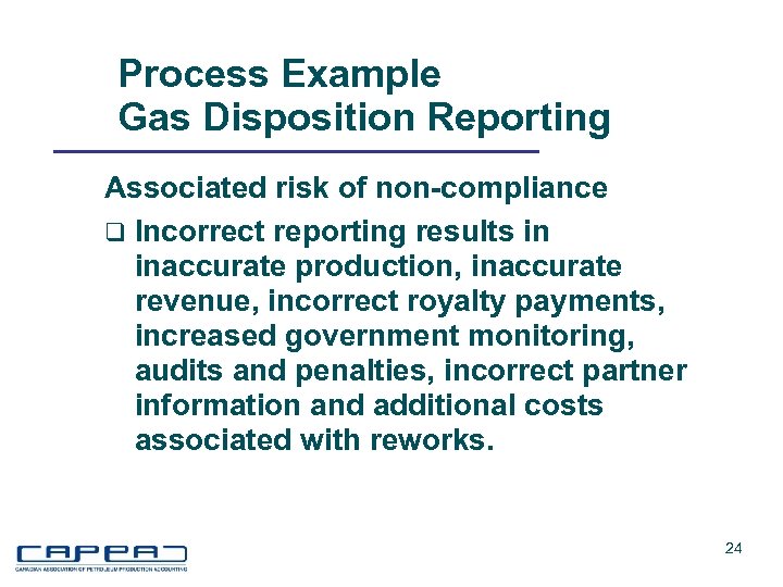 Process Example Gas Disposition Reporting Background q Gas disposition volumes are used to calculate gas volumes at a facility or well therefore the gas volumes must be reported in an accurate and timely manner 23