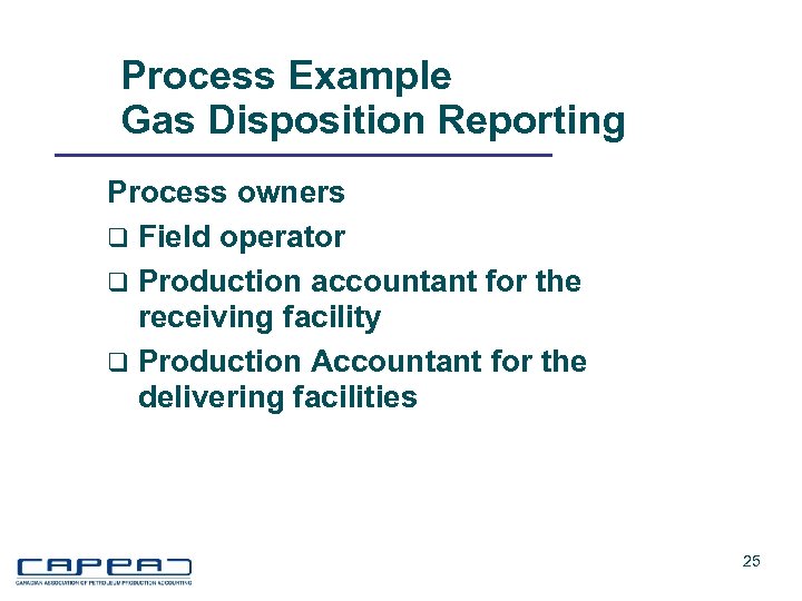 Process Example Gas Disposition Reporting Associated risk of non-compliance q Incorrect reporting results in inaccurate production, inaccurate revenue, incorrect royalty payments, increased government monitoring, audits and penalties, incorrect partner information and additional costs associated with reworks. 24
