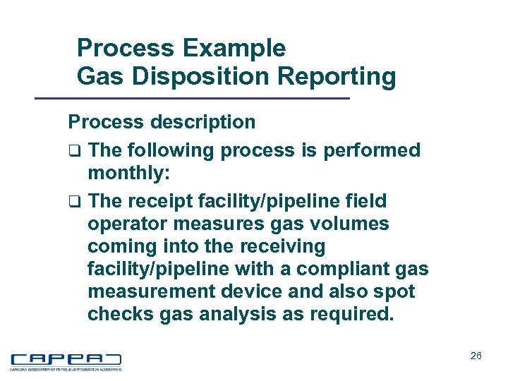 Process Example Gas Disposition Reporting Process owners q Field operator q Production accountant for the receiving facility q Production Accountant for the delivering facilities 25