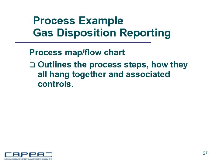 Process Example Gas Disposition Reporting Process description q The following process is performed monthly: q The receipt facility/pipeline field operator measures gas volumes coming into the receiving facility/pipeline with a compliant gas measurement device and also spot checks gas analysis as required. 26