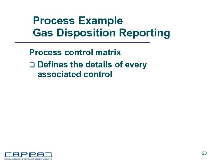 Process Example Gas Disposition Reporting Process map/flow chart q Outlines the process steps, how they all hang together and associated controls. 27