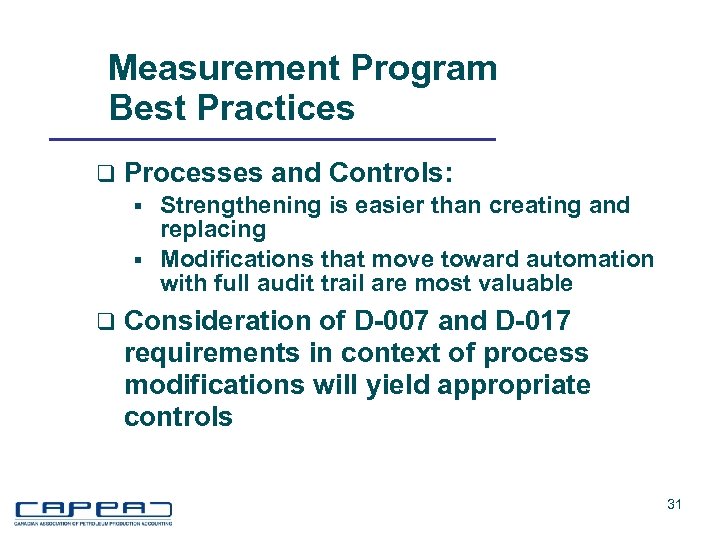 High-Level Considerations q All operators have measurement and reporting business processes Are they documented? § Do they leave an audit trail? § q Also have controls that assure timely and quality results from processes Automated or manual? § Facility-level or Company-level? § Do they assure D 007 & D 017 compliance? § q Answers influence EPAP approach 30