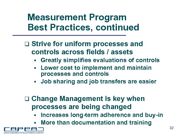 Measurement Program Best Practices q Processes and Controls: Strengthening is easier than creating and replacing § Modifications that move toward automation with full audit trail are most valuable § q Consideration of D-007 and D-017 requirements in context of process modifications will yield appropriate controls 31