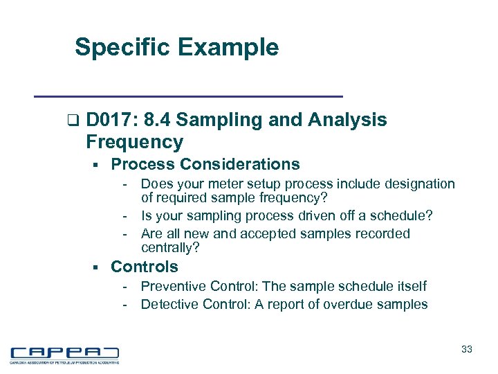 Specific Example q D 017: 8. 4 Sampling and Analysis Frequency § Process Considerations - Does your meter setup process include designation of required sample frequency? - Is your sampling process driven off a schedule? - Are all new and accepted samples recorded centrally? § Controls - Preventive Control: The sample schedule itself - Detective Control: A report of overdue samples 33
