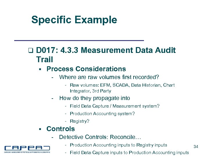 Specific Example q D 017: 4. 3. 3 Measurement Data Audit Trail § Process Considerations - Where are raw volumes first recorded? - Raw volumes: EFM, SCADA, Data Historian, Chart Integrator, 3 rd Party - How do they propagate into - Field Data Capture / Measurement system? - Production Accounting system? - Registry? § Controls - Detective Controls: Reconcile… - Production Accounting inputs to Registry inputs - Field Data Capture inputs to Production Accounting inputs 34