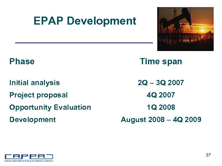 EPAP Development Phase Time span Initial analysis 2 Q – 3 Q 2007 Project proposal 4 Q 2007 Opportunity Evaluation 1 Q 2008 Development August 2008 – 4 Q 2009 37