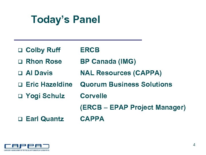 Today’s Panel q Colby Ruff ERCB q Rhon Rose BP Canada (IMG) q Al Davis NAL Resources (CAPPA) q Eric Hazeldine Quorum Business Solutions q Yogi Schulz Corvelle (ERCB – EPAP Project Manager) q Earl Quantz CAPPA 4